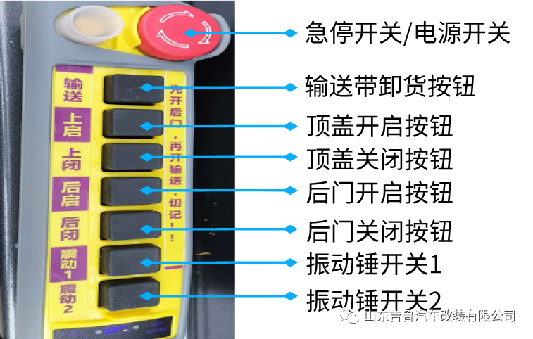 03 通过观察显示器,确认卸货完成后,关闭输送按钮;关闭后门;关闭取力开关;关闭遥控器电源开关,完成卸货全过程。