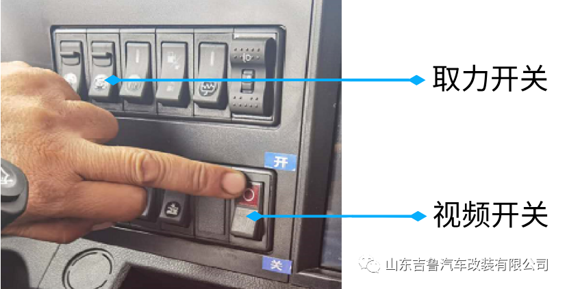 01 确认尾部已进入可卸货范围后;打开视频开关,打开取力开关、打开遥控器电源开关。